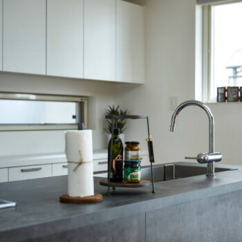 また、洗面所には、S様ご夫婦のこだわりがたくさん詰まっている。忙しい朝も家族が一度に鏡の前に立てるように、横長サイズの鏡を設置。小物置の板はガラスにしてホテルライクに。洗面所にもトイレにも、S様の名古屋モザイクのコラベルタイルを取り入れ、日々の暮らしがお気に入りで彩られている。